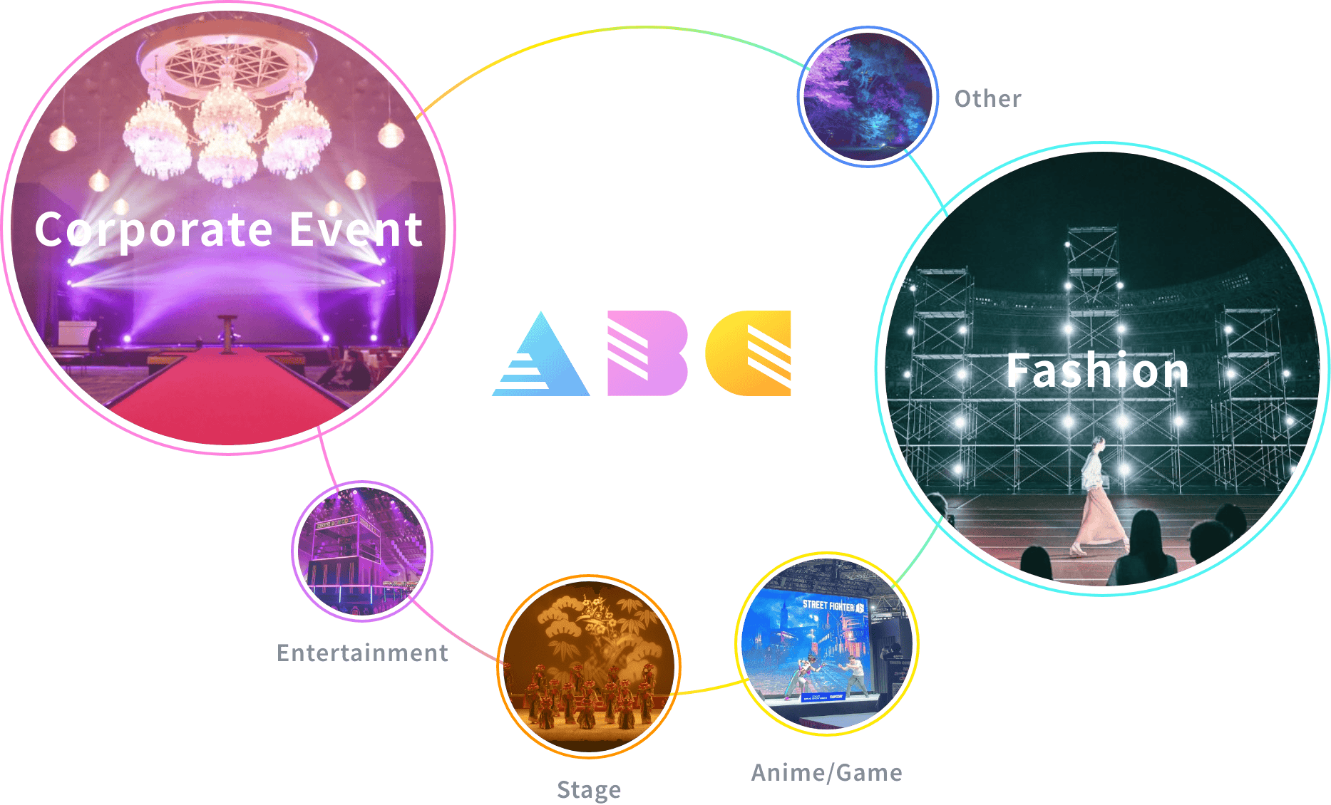 年間の現場数 約 2,000 件 1.企業イベント 2.ファッション関連イベント 3.映画・動画配信イベント 4.展示会・博覧会 5.アニメ・ゲームイベント 6.コンサート・演劇・発表会 7.スポーツ 8.エンターテイメント 9.イルミネーション 10.地域イベント 11.セミナー・講演会