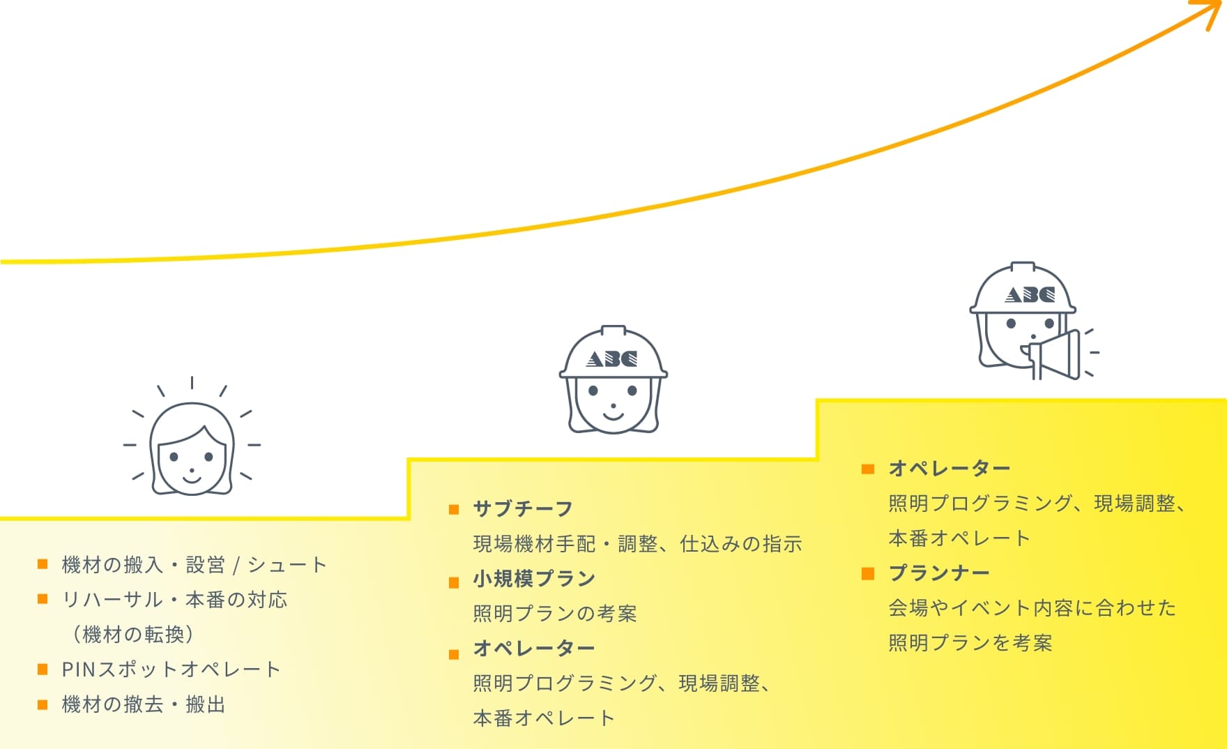 機材管理部門が独立していないため、機材の扱いから照明に関するあらゆる知識・技術を習得できます。